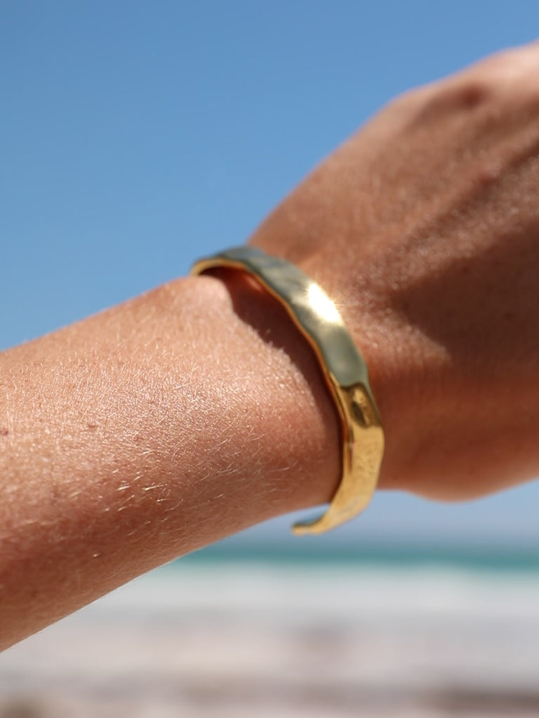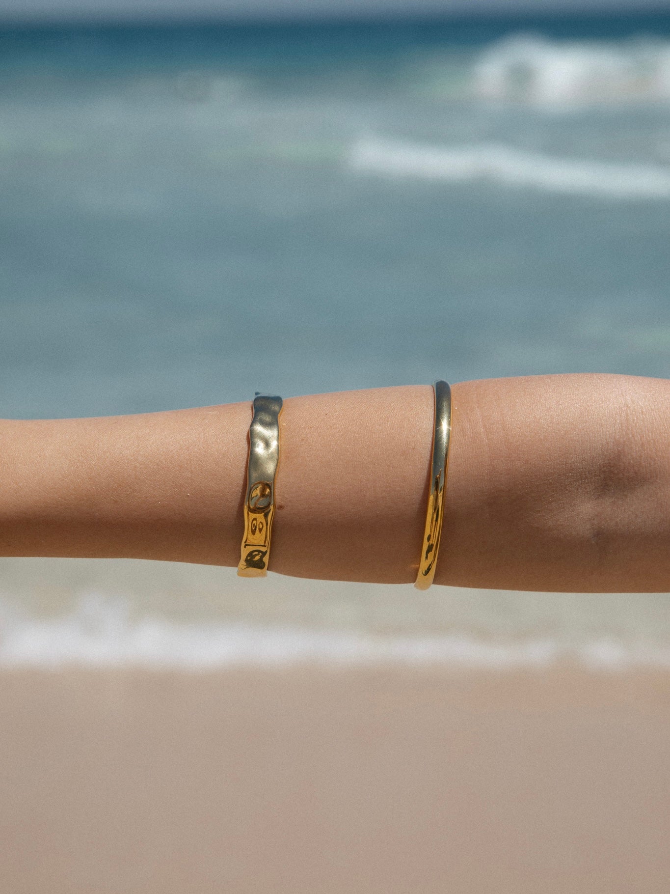 Our Cairo Cuff mirrors the rhythm of the sea. Its rippled surface flows like water in motion - effortless, fluid and endlessly captivating. Crafted from waterproof, tarnish-proof materials, this piece is made to move with you - through sun, salt and every tide in between.
