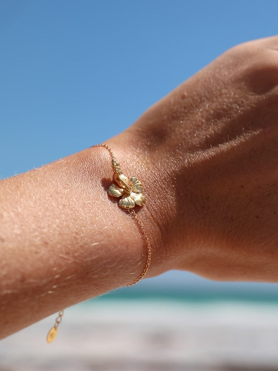 Carry the tropical essence with you always with our Hibiscus Bracelet. A delicately crafted hibiscus pendant on an adjustable chain, perfect for elevating any look.