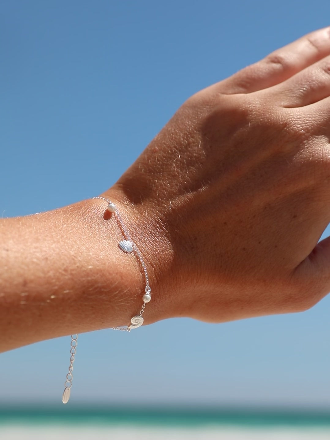 If you share our love for the ocean, you'll be captivated by our Kula Kabana beachy bracelet. Adorned with shells, starfish, and pearls, it brings the essence of the ocean with you wherever you are.